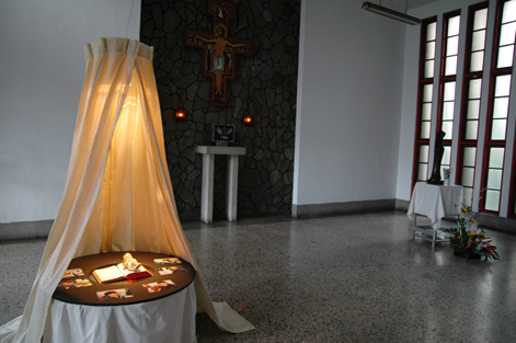有一個未實現的構想,那是將帳棚做成向地倒開的百合花形狀,就像是巴勒斯坦聖地納匝肋(拿撒勒)的聖母領報大殿的圓錐屋頂造型。 放置在翻開的思高版聖經上的聖嬰塑像,填滿了整個馬槽的意義的核心。翻開的左頁是《若望福音》的開端,聖嬰則躺臥在右頁空白處。左頁是若望團體關於基督的信仰反省與神學,而所談論對象則在右頁現身而出。 這個白冷聖經(思高聖經的另個名稱)與聖嬰的聯合構造,放置在圓形的明鏡上。明鏡至少有兩個指涉,一個與節期有關,另一個則帶有方濟會色彩。『…他是天主光榮的反映,是天主本體的真像,‥(Heb 1:3)』,這是聖誕節天明彌撒的第二篇讀經,是在強調基督在救恩計畫下,在啟示當中所具有的獨特地位。為方濟會背景來說,聖佳蘭寫給Bl. Agnus of Prague的第四封書信當中14~26節(方濟會全集2902~2904),以「明鏡」之喻來談論對於耶穌基督的默觀。在明鏡的邊緣,是被放置在馬槽,及用襁褓所裹起來的他的貧窮;在明鏡表面上,留意到他為救贖整個人類所忍受的聖善謙遜、有福貧窮、勞苦及負擔;在明鏡的深處,則可靜觀那不可言喻的愛德,這愛德引領他在十架上以最羞辱的方式死去。 明鏡的兩個指涉,在基督降生的目的當中獲得了統合。(若我們順著天明彌撒的讀經一,即先知書《依撒意亞》52:7-10,再往下閱讀,將碰到其中一首的上主僕人詩歌…‥這是四旬期默想的題材了。) 明鏡區域以外的黑色圓桌部分,放置了六張痲瘋病人的相片,這是在說基督的降生,是進入了人類悲慘的生存境況當中,且與人類處於同樣的高度。此外,痲瘋病人進入帳幕內部(亦即聖域),這是在說耶穌的到來,重新立下了潔╱不潔及聖╱俗的區分;他帶來了新秩序,他要重新引導人們獲得自由。「因為法律是藉梅瑟傳授的,恩寵與真理卻是由耶穌基督而來的。(Jn 1:17)」 光也是一個重要因素。『在他內有生命,這生命是人的光。(Jn 1:4)』,那麼,象徵性的光源亦能象徵生命之源?光從帳棚頂部向下投射,打在降生成人的聖言上,象徵著本原與其表詮者(聖子可說是父的表詮者…「從來沒有人見過天主,只有那在父懷裡的獨生者,身為天主的,他給我們詳述了(Jn 1:18)」)的關係。聖子反映的是聖父的光榮,他的光源自於聖父,在他內能夠迴返至本原,能窺見本體之真相;當投射光經由明鏡之反射,轉變方向時,這又象徵著聖子將其光榮回歸於聖父。 光的非預期效果在於一種令人聯想到美滿家庭的溫暖。「想要回家」是基督信仰內部的強大的心理動因。既帶有漂泊特徵,又具有家庭溫暖的矛盾組合,光之帳棚有其寓意,此世的居所是暫時的,生命的本原才真是家鄉。 註 [1] 這篇馬槽的解說文字原發表於https://ofm-postulants.blogspot.com/2007/12/blog-post_28.html以及https://ofm-postulants.blogspot.com/2007/12/2007.html |