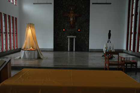 這個帳棚不是緊密合攏,而是敞開的。將遮蔽物揭露開來,使人能窺見內裡堂奧,這是以視覺來表現天主對人的啟示。 整個帳棚沒有用一根柱子,而是由兩條鐵線,分別固定在天花板的掛勾上。由上懸吊垂墜,而非由地向上搭造的這件事,也能夠有象徵性意義。