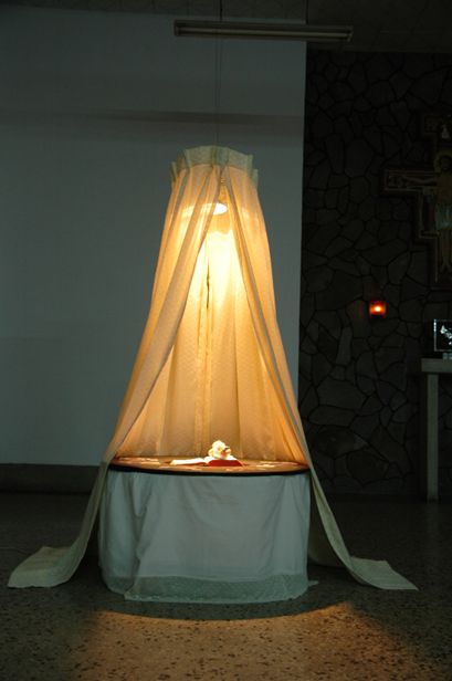 取材自會院窗簾,以及電風扇網蓋所構成的帳棚,在搭配了下座,而往下、往外撐開時,產生了非預期的效果。帳棚的最上端像是聖母的后冠,簾布開敞、略帶弧度的樣式,像是聖母的頭紗兼斗蓬,布的曳地下緣又像是聖母的裙擺。